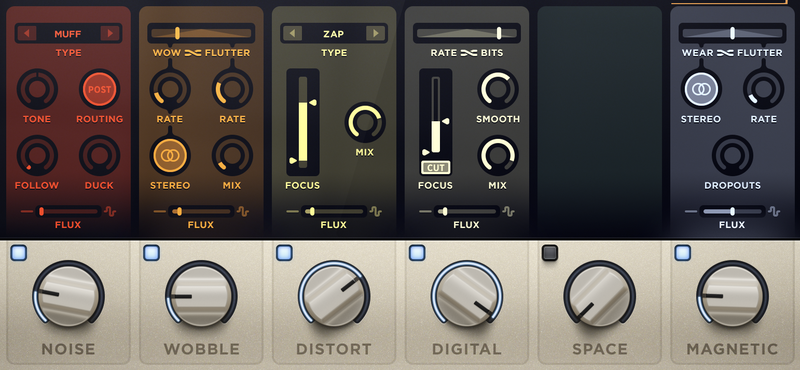 RC-20 starts with its Noise module, which offers 16 types ranging from Vinyl and Tape through electronic noises, cassettes and VHS, white noise, pink noise and more. Next comes the Wobble processor, which offers control over simulated wow and flutter, allowing you to set both independently and blend between them.