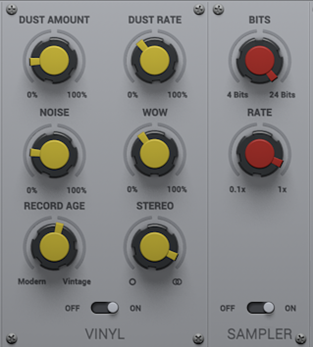 There are all the ‘faults’ that make vinyl such a nostalgic format, with Dust and Scratches, Mechanical Noise, Wear, Electrical Noise and Warping all dialled in via the main six sliders. Dust and Scratch amounts are set by the two little knobs next to these, and there’s a Spin Down button for doing the classic ‘record stop’ function.