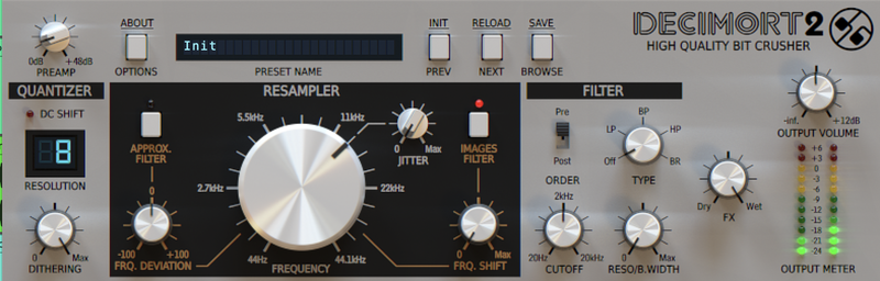 Bitcrushing is the process of simulating a lower sample rate than the original audio’s, imposing, for example, an 8-bit depth and a low sample-rate on pristine audio. Decimort can do exactly that – and plenty more besides.