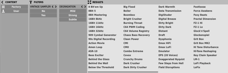 If you’re simulating classic video game music or even early sampling technology for LoFi hip-hop production, bitcrushing could be a strong part of your musical vocabulary. Decimort’s presets include settings that intentionally emulate old samplers like the Akai MPC and E-mu’s SP-1200, and 8-bit game-style sounds too.
