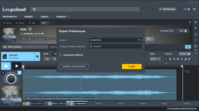 You can also set your export preferences on Loopcloud to adjust the type of file you’d like to export in future. With this function, you have several options: Current Mix, Original File, Processed Separate Files, Processed Current Track and Original Separate Files. Exporting out separate files will deliver the individual layers in isolation, which can be useful if you want to do more in depth processing in your DAW.