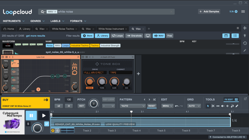 We’ll start by adding a white noise sample into Track 1. Because we’re looking to create a background texture, it’s important to choose a sample with an even volume profile that you can loop seamlessly. Our sample is a downlifter from the Cyberpunk Mid Tempo pack, so we’ll reduce the volume from the first section of the sample and make it more even. Add an EQ with a low cut filter to cut out everything below 1kHz and give it some air, and then add Tonebox with the A Dash of Fuzz preset to fizz it up somewhat.