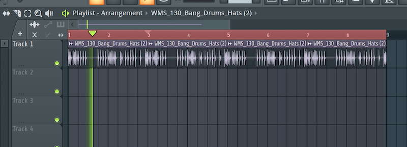 Now we can audition each sample that Loopcloud has found. The sample ‘WMS 130 Bang Drums Hats’ is a very nice-sounding hi-hat loop. We’ll start our drum beat here. Purchase the loop by clicking the + button, then load it in FL Studio by dragging it from the plugin and onto the timeline of FL Studio.