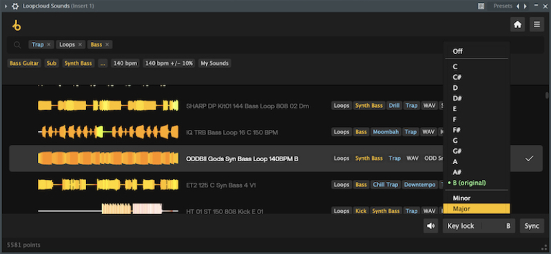 Fortunately, Loopcloud Sounds has our back. By activating Key Lock in the bottom right-hand corner of Loopcloud Sounds, and selecting the key of the track (which in this case is B major), when we audition samples in Loopcloud Sounds they will automatically be pitch-shifted to match the key of the FL Studio project.