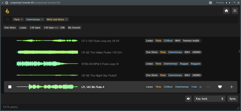 Let’s have a listen to some of the flute options. As with our chords we will used Loopcloud Sounds’ key lock feature to audition samples in key with our beat. We’ll click on the Flute option in the instrument page and Loopcloud Sounds will automatically search for all flute samples.