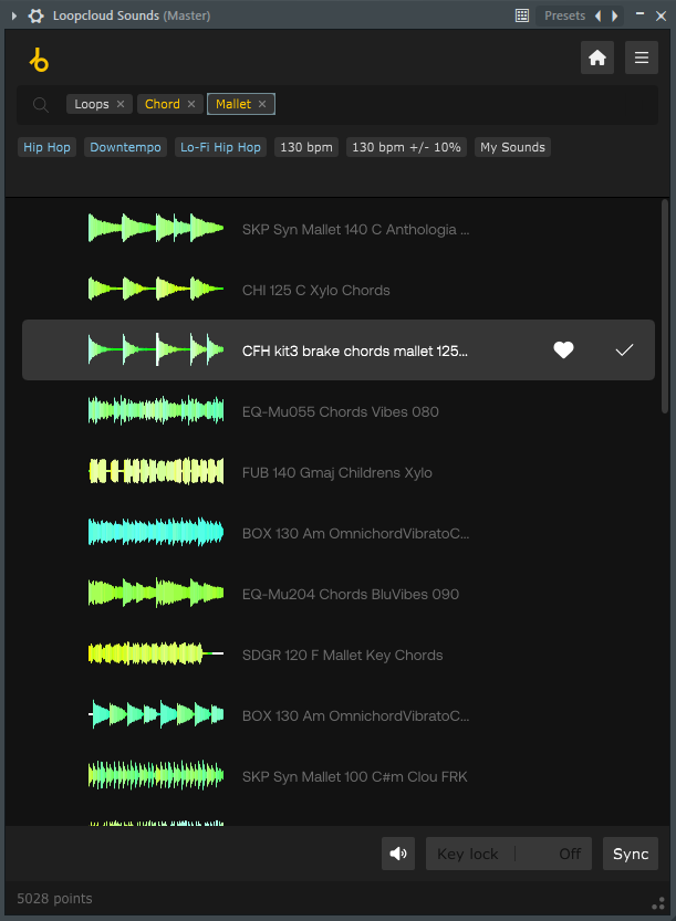 Once you’ve found a suitable loop to work with, you can add it to your favourites by clicking the heart-shaped button and purchase it with your Loopcloud credits by clicking the ‘+’ button. We’ve gone with a 125bpm mallet chord progression in the key of F Minor.