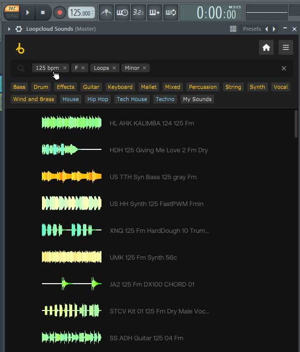 First, open up an instance of Loopcloud Sounds on your Channel Rack and search for a fitting chord loop. You can audition samples from within the browser by clicking the Play button in the left-hand side column.