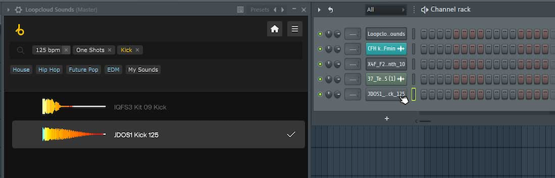 First, use the Loopcloud Sounds browser to find a kick sample of your liking, then drag the sample into your Channel Rack.