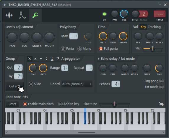 To add your bass to a choke group, head over to the Miscellaneous Functions section of your bass’ sampler window (the same panel that houses the keyboard mapping) and click the ‘Cut self’ button.
