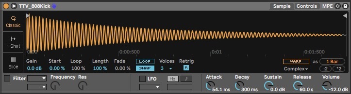 We’ve loaded the 808 kick into a sampler and increased the attack time to give the punchy kick more space.