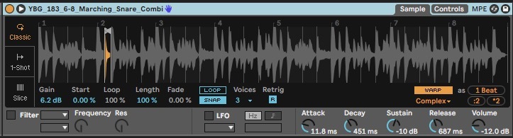The final element of the drums is the marching snare-style percussion. We isolated a single hit from the YBG_183_6-8_Marching_Snare_Combi loop, pitched it up by five semitones and adjusted the amplitude envelope.