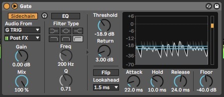 With your sound selected and your melody written, place a gate on the channel. While the gate pattern follows that of the percussion, using a simple synth gives us slightly more control over the shape of the gate.