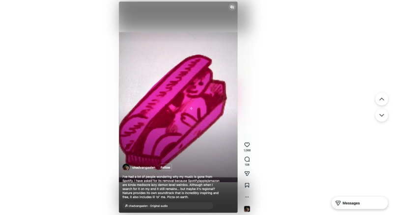 In February 2025, Chad VanGaalen, the Canadian indie, folk, and electronic artist, was amongst the many artists to announce a decision to pull their music from Spotify, Apple Music, and Amazon Music. He wrote bluntly, “I have asked for [my music’s] removal because Spotify/Apple/Amazon are mediocre lazy demon level weirdos.” VanGaalen’s music remains available on Bandcamp, Tidal, and Apple Music.
